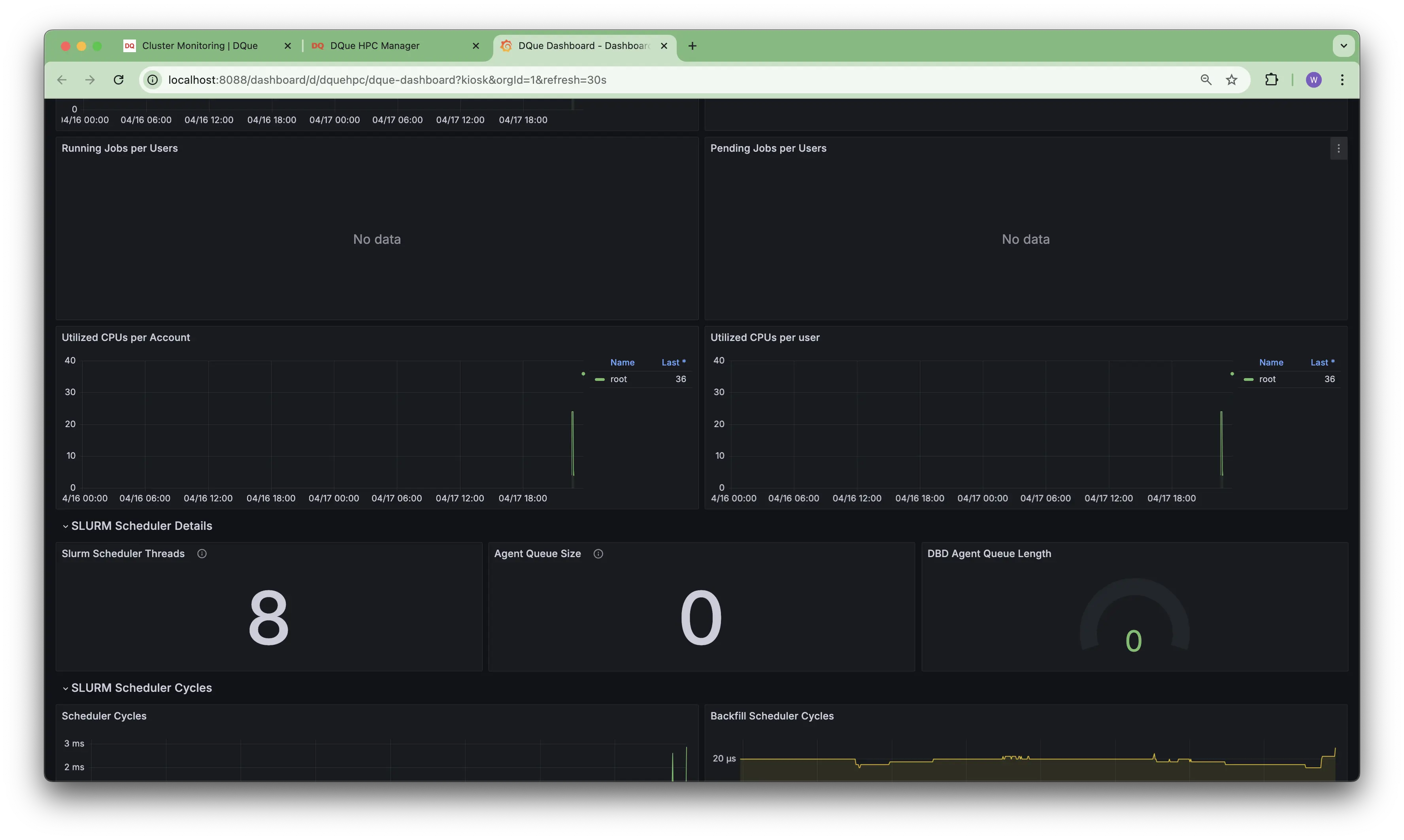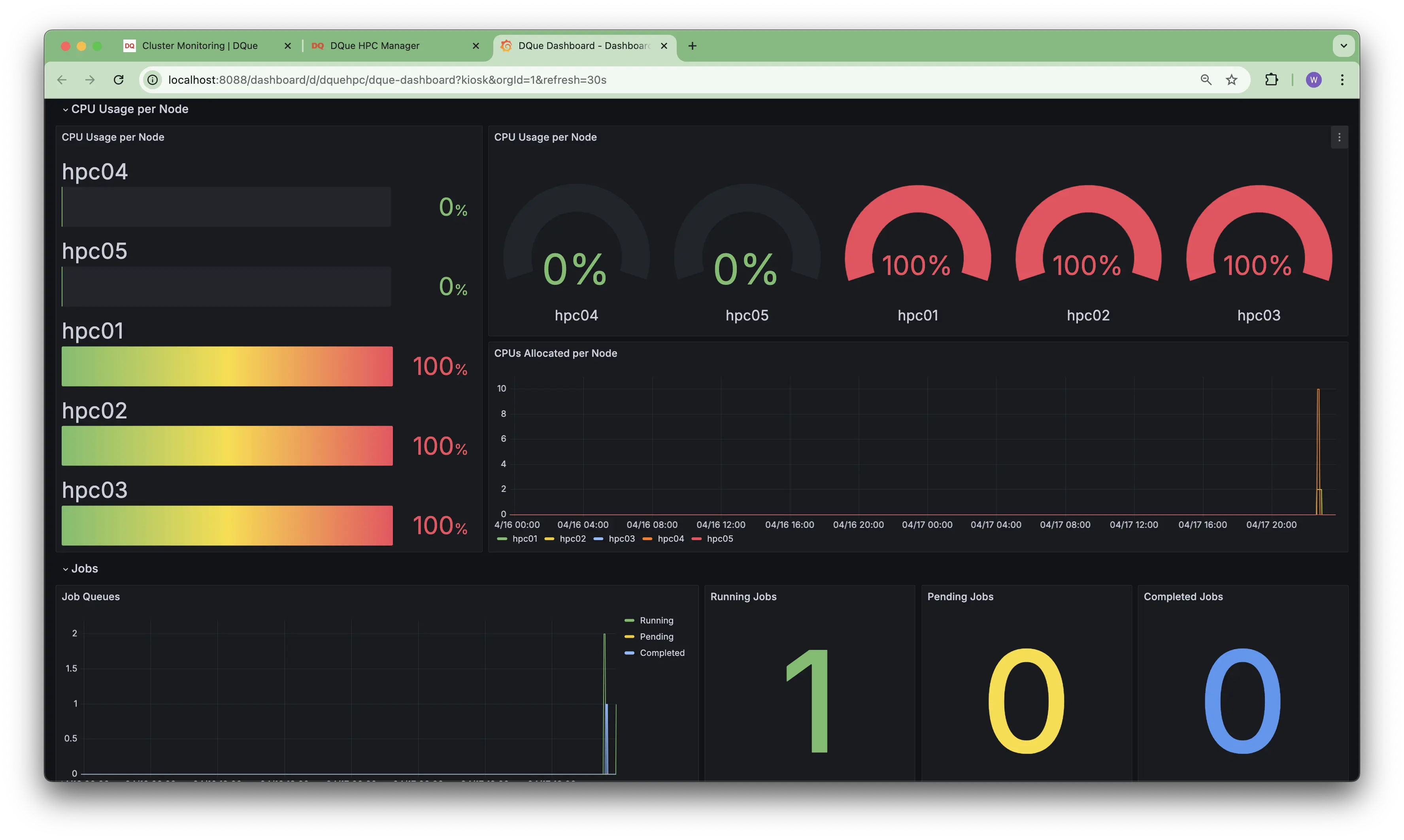 - Job Queues (Graph): Tracks the number of running, pending, and completed jobs over time (cluster-wide).