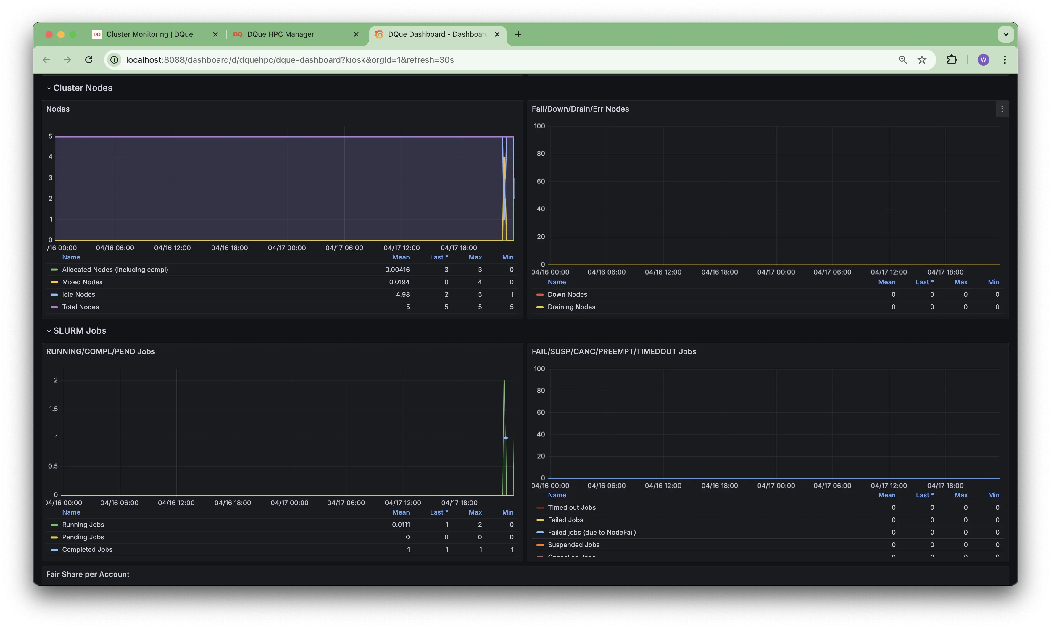 - Fair Share per Account: Monitors the Slurm fair share value for different accounts.