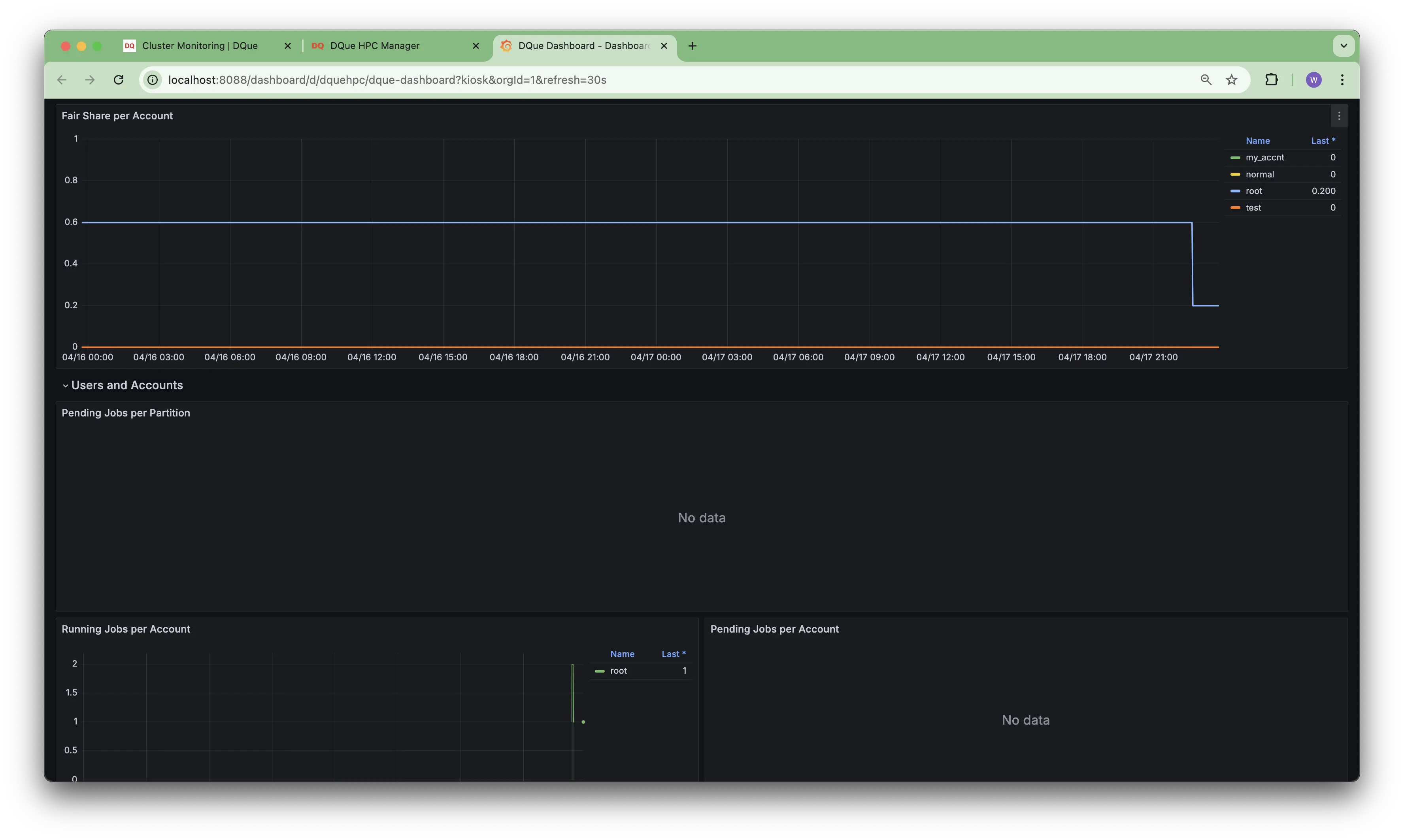 - Pending Jobs per Account: Shows pending job counts per account (may show “No data” if none are pending).