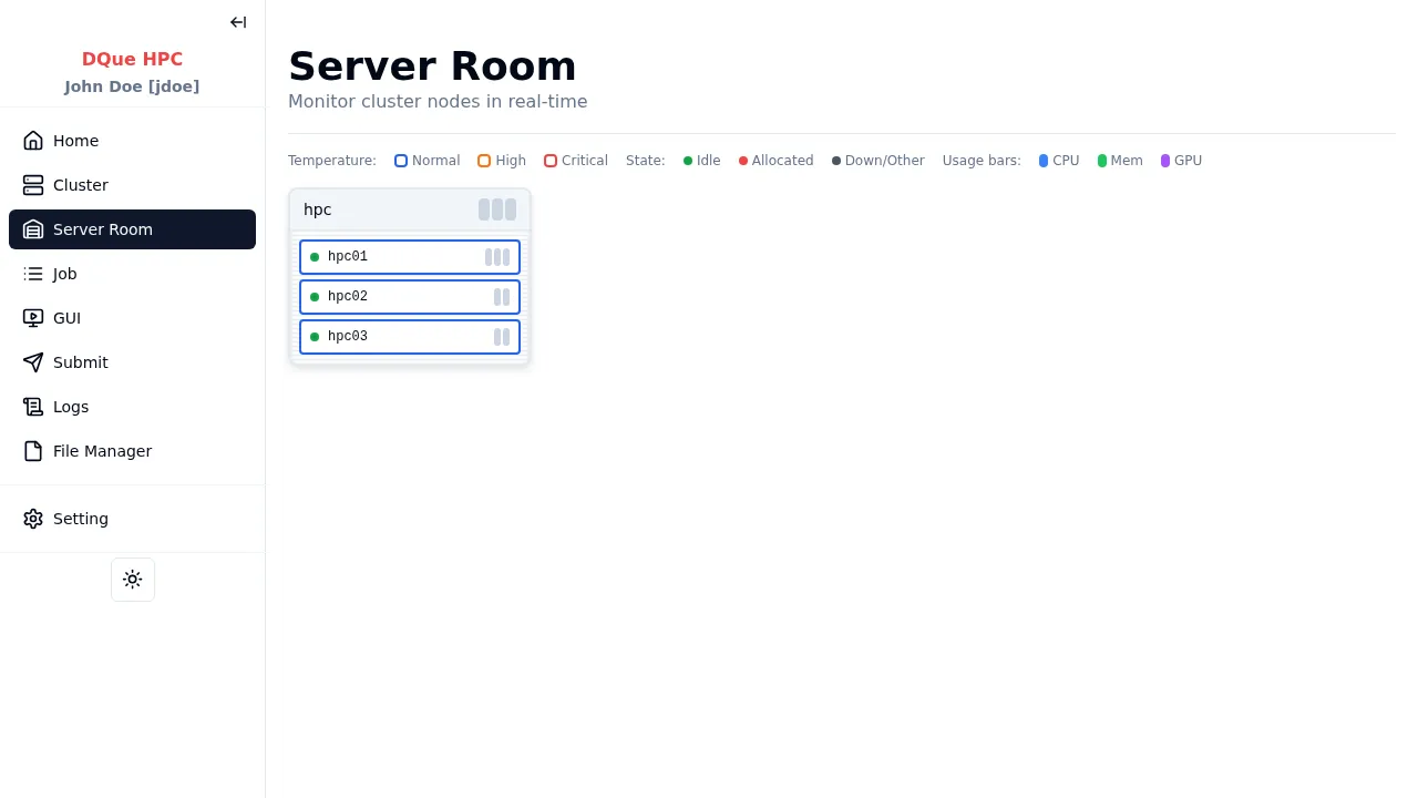 - Color coding — nodes are colored by state (idle, allocated, down) and temperature.