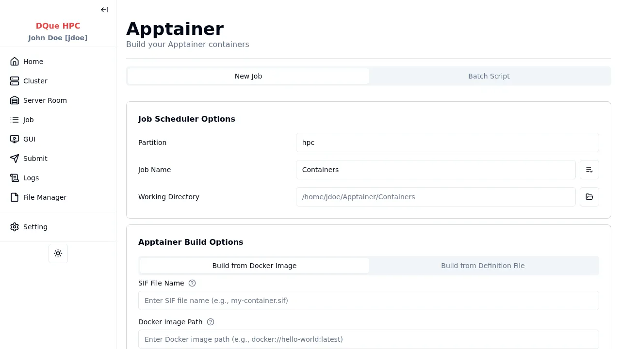 Build Apptainer/Singularity container images (.sif files) as SLURM batch jobs. You can build from a Docker image or from a definition file.