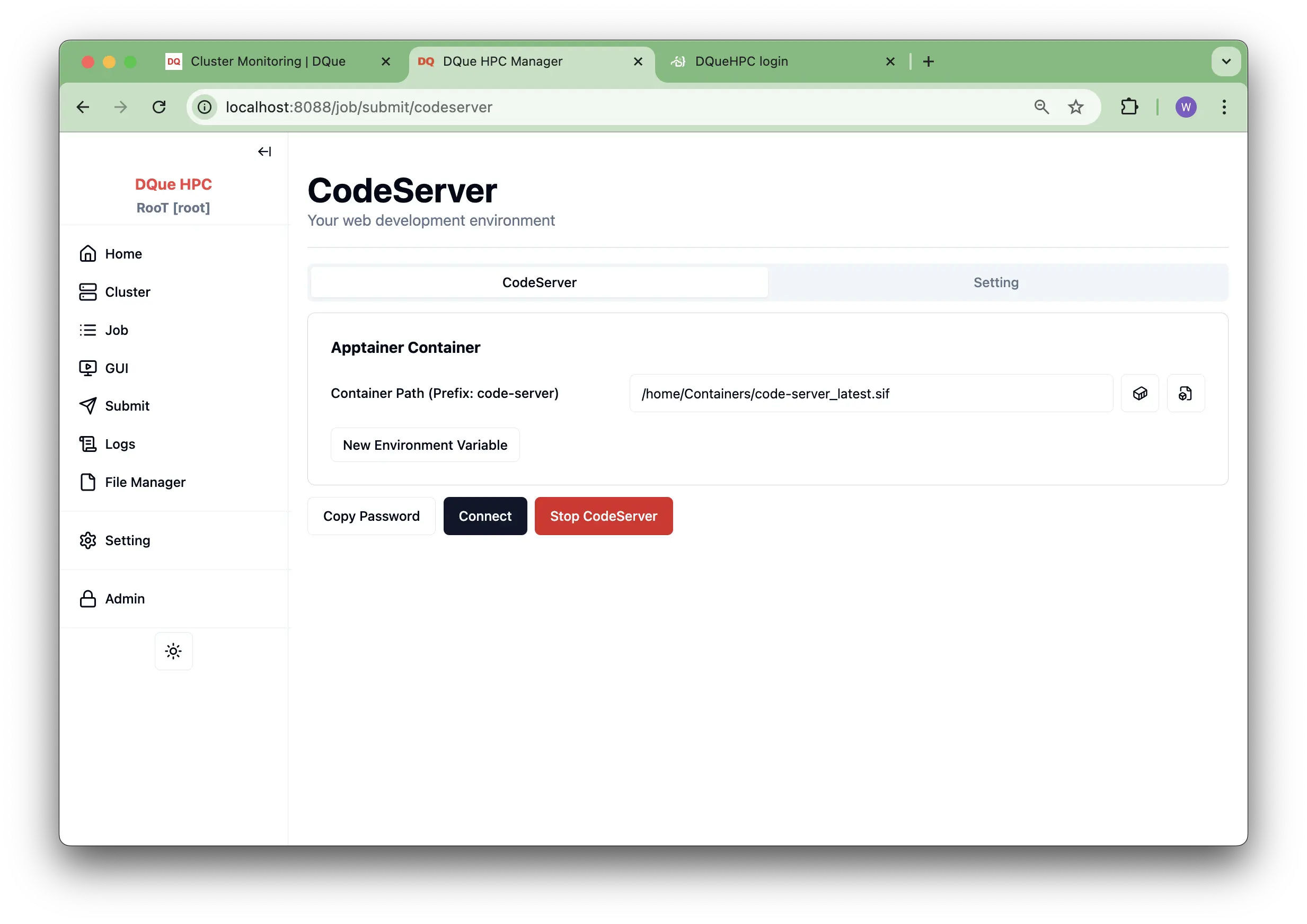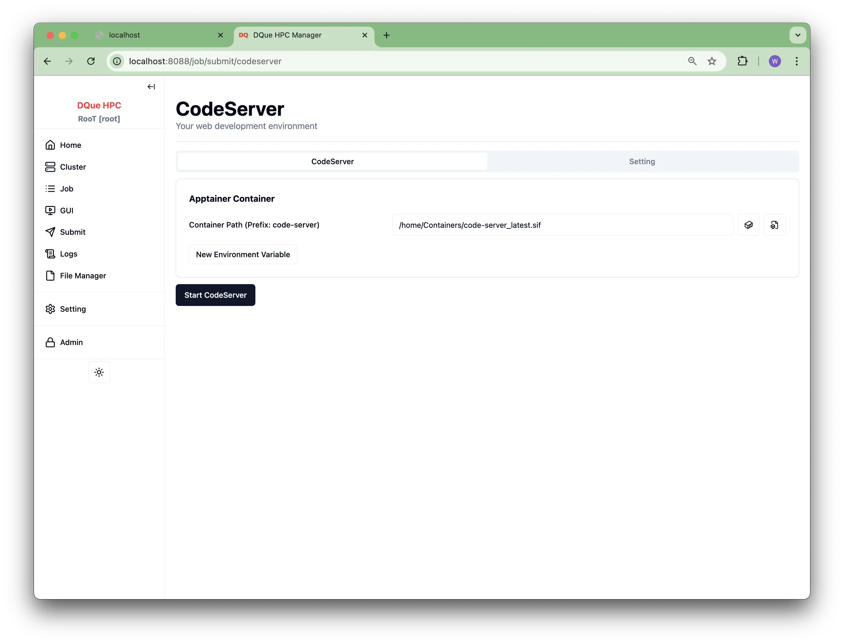 /home/Containers/code-server_latest.sif). This path is typically managed by system administrators. - New Environment Variable: Add any necessary environment variables required for your development environment within the container.