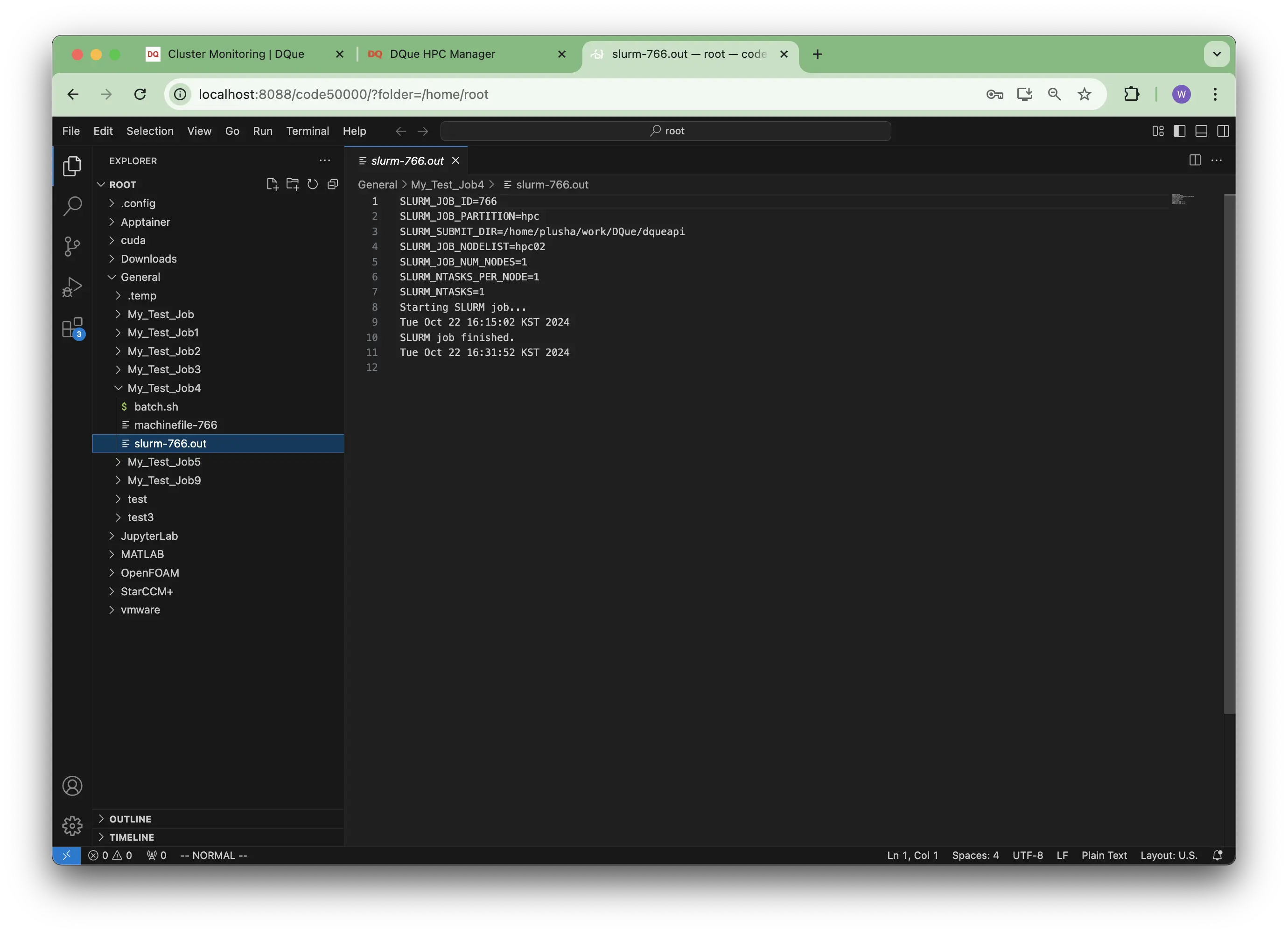 You can use the integrated terminal, file explorer, editor, and extensions as you normally would in VS Code, operating within the container environment on the HPC cluster.