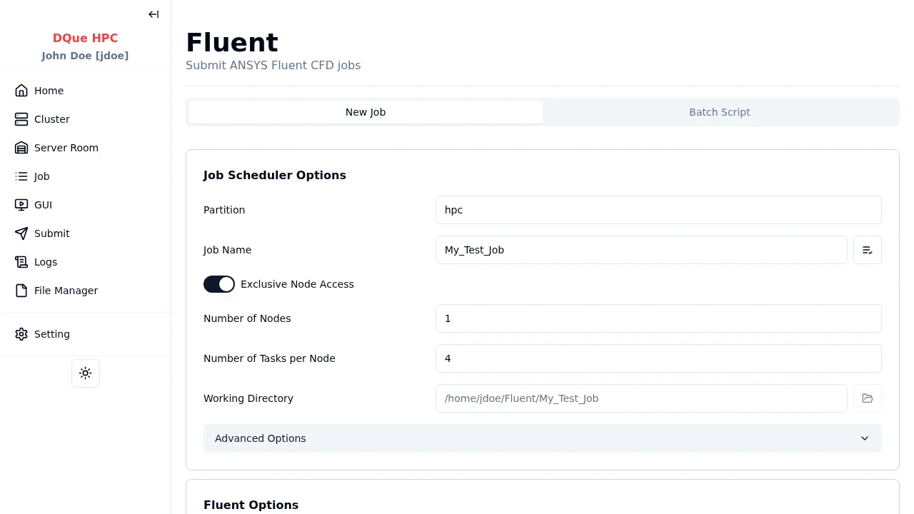 Submit ANSYS Fluent CFD solver jobs. This app promotes multi-node fields to the basic section.