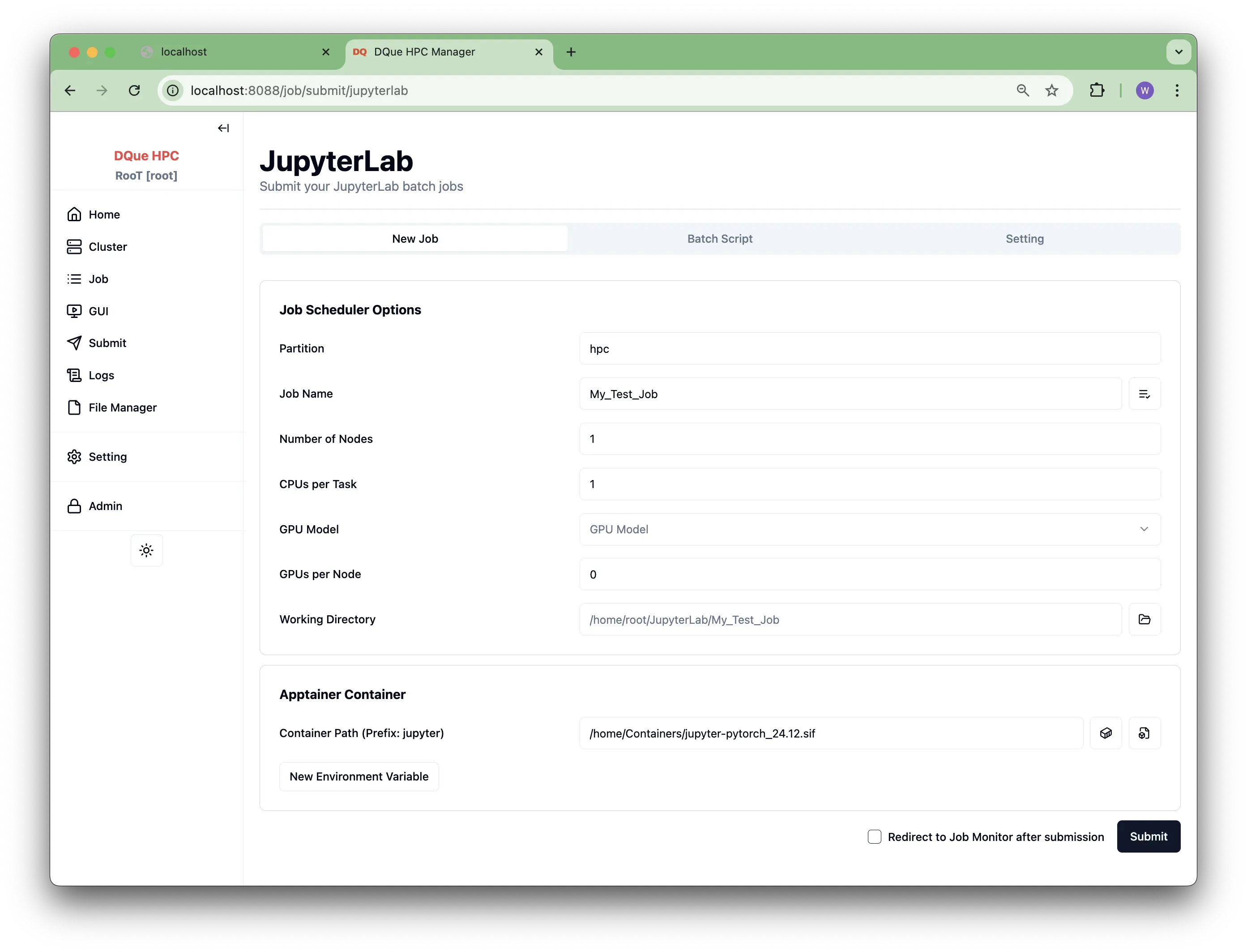 Section titled “3. Submission”- Redirect to Job Monitor after submission: Check this to automatically go to the Job Monitoring page after submission.