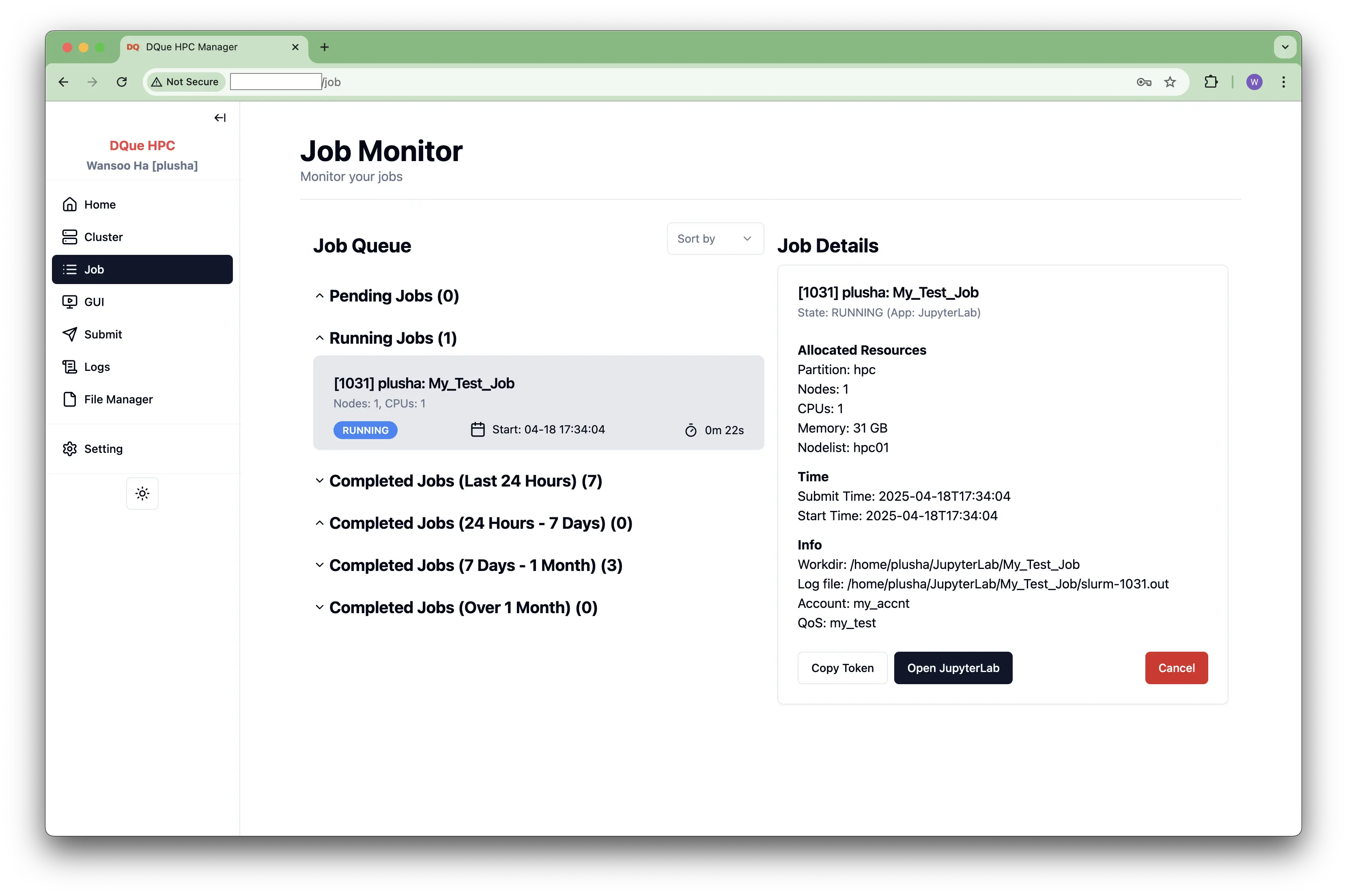 Once the job starts running, you will typically receive connection details (like a URL with a token) in the job’s log file, which you can access via the Job Logs page.