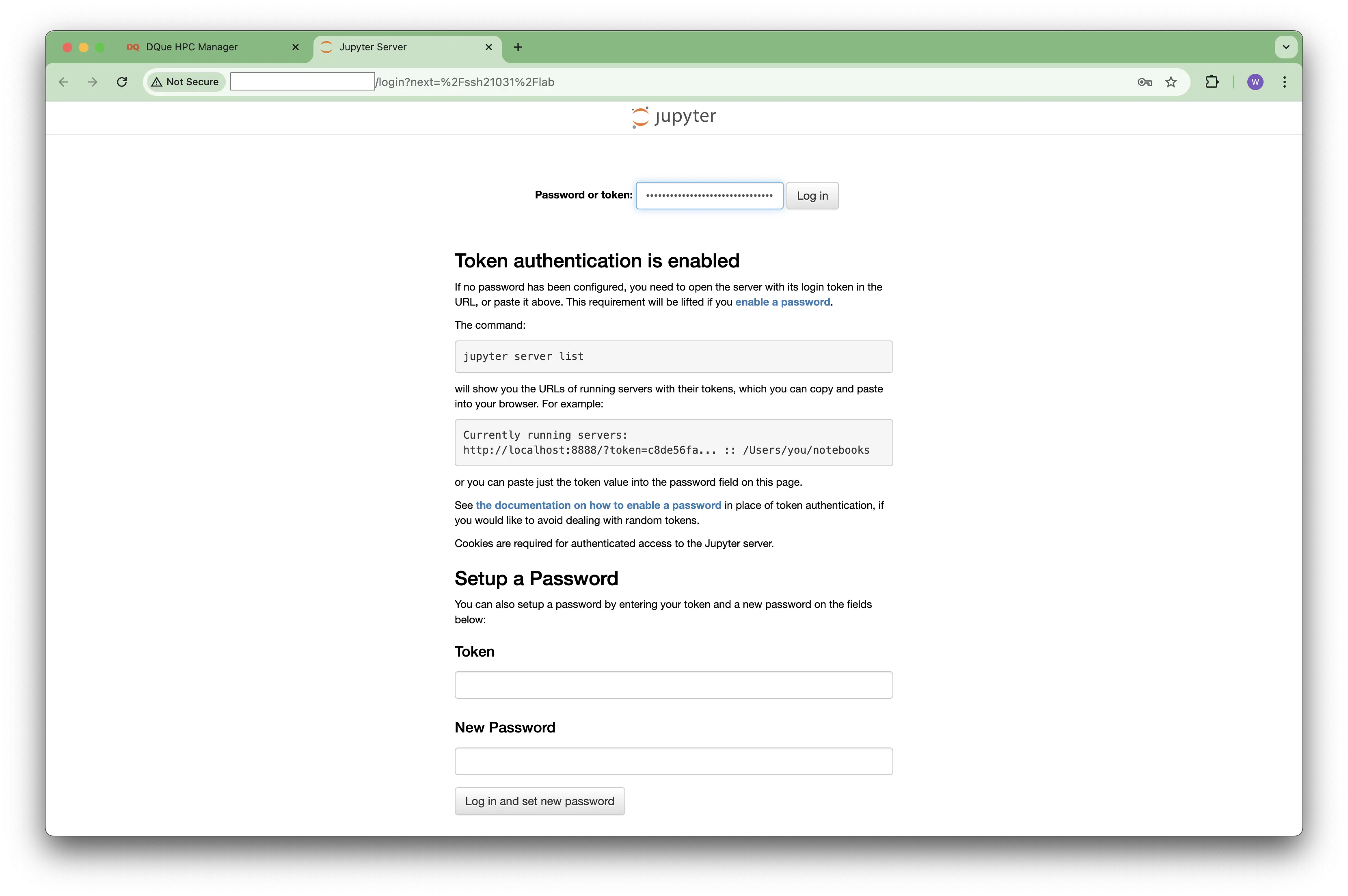 - You’ll be redirected to the JupyterLab login page where authentication is required