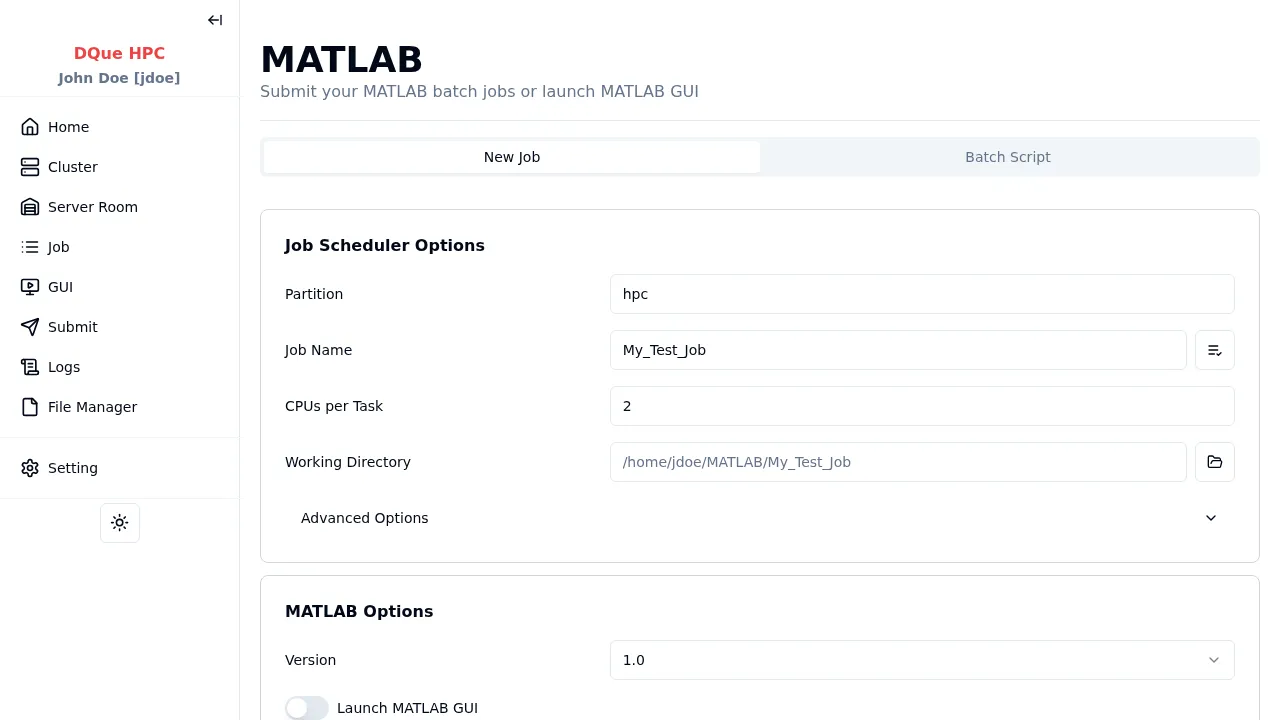R2024a). Available versions are configured by your admin. - Launch MATLAB GUI — toggle between batch mode and GUI mode.