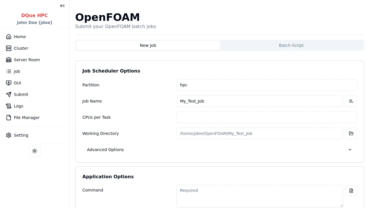 Section titled “Step 2: Application Options”- Command — OpenFOAM commands to execute (required), e.g.,