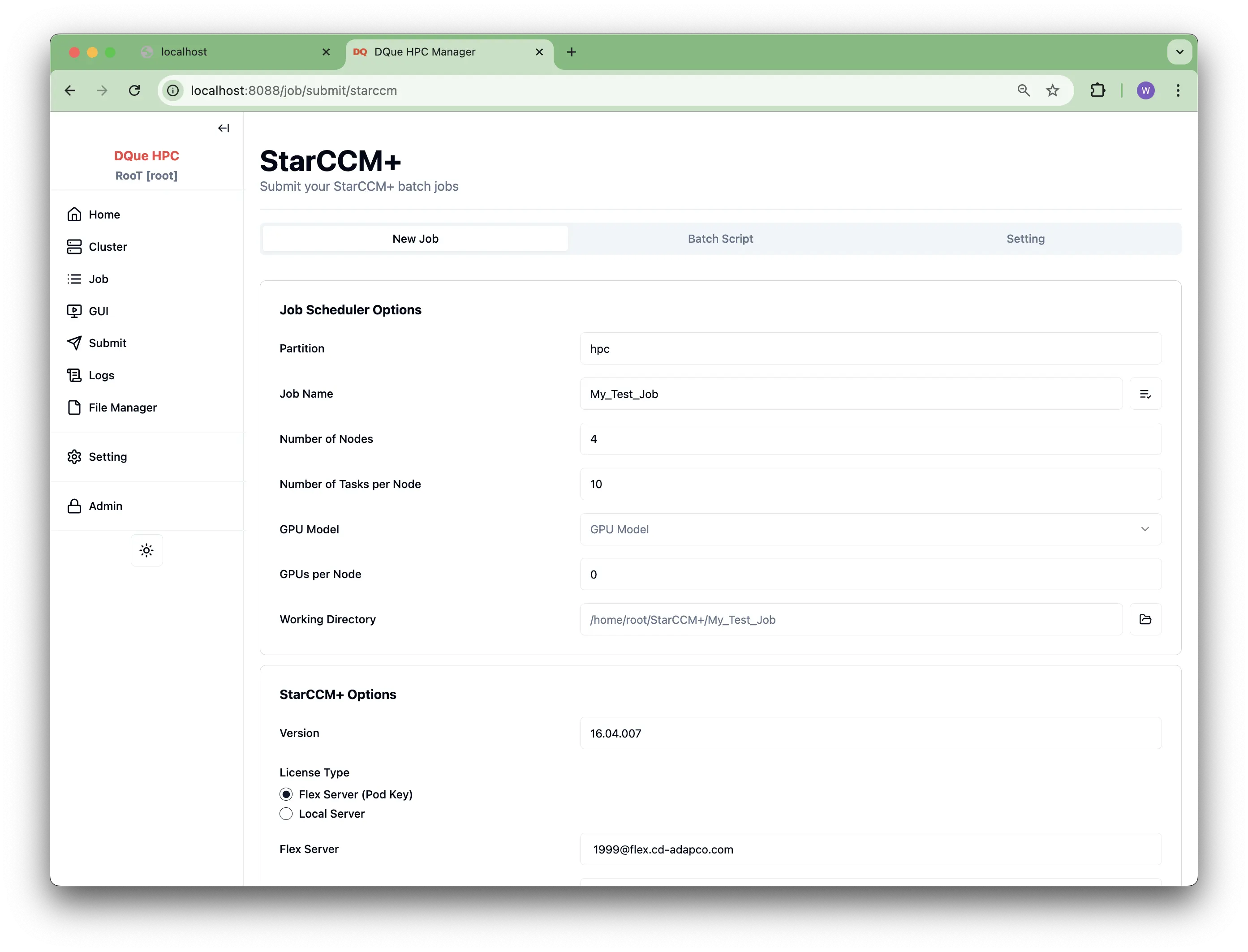 Section titled “Job Submission Tabs”Similar to other job types, the form includes tabs like “New Job”, “Batch Script”, and “Setting”. This guide focuses on the “New Job” tab for submitting StarCCM+ jobs.