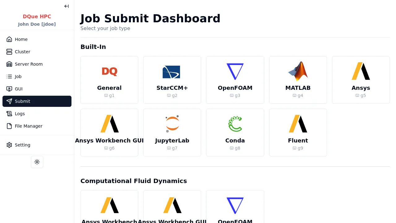 작업 제출 대시보드는 모든 작업 제출의 진입점입니다. 카테고리별로 그룹화된 애플리케이션 카드 그리드를 표시합니다.