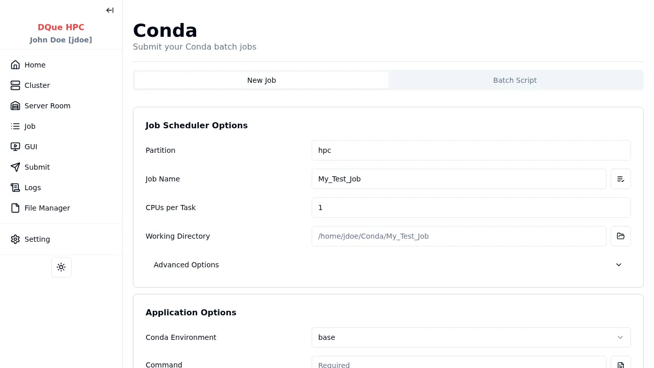 Section titled “2단계: 애플리케이션 옵션”- Conda 환경 — 클러스터에서 사용 가능한 conda 환경을 선택합니다 (