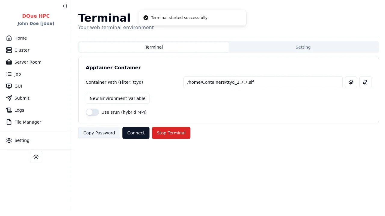 Section titled “2단계: 터미널 시작”터미널 시작 을 클릭하여 터미널 서비스를 시작합니다. 터미널이 실행되면 페이지에 연결 컨트롤이 표시됩니다.